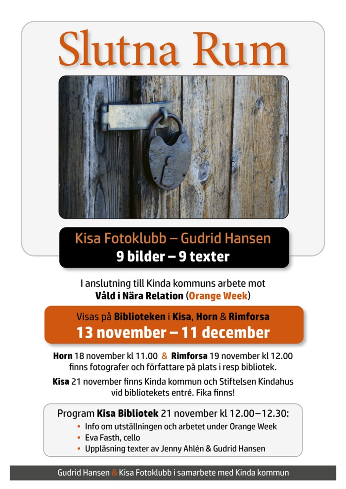 - Vernisage utställningen "Slutna rum" vid Kisa bibliotek 12.00 - 12.30